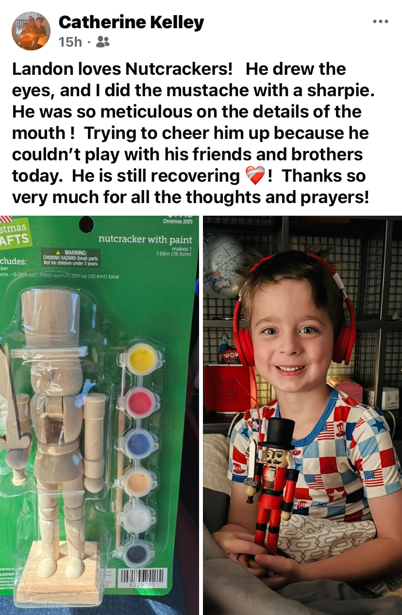 Update on Cath’s grandson Landon!! He still has a bad cough but he is getting better. His Grandma makes sure he has activities to stay happy and have some fun!! They painted a nutcracker together! Thank you for your prayers!! They are working!!
