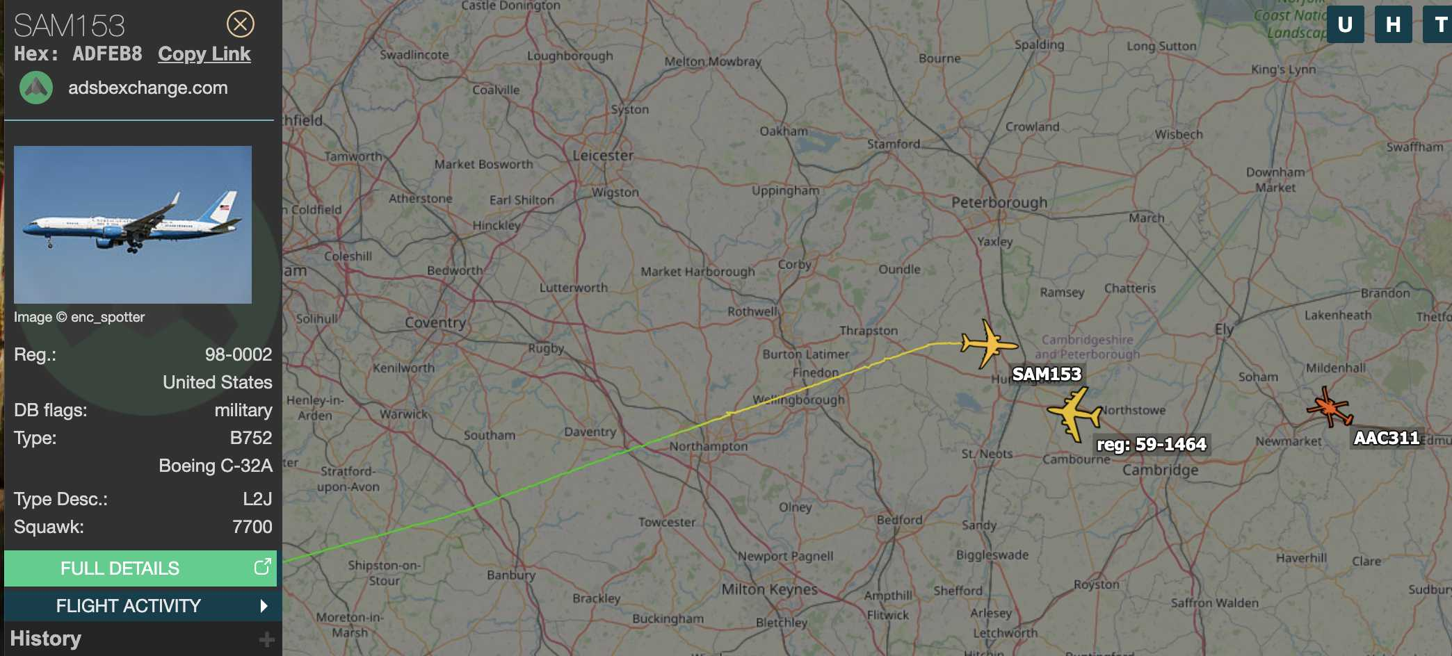 SAM153 heading into the UK. Turned around after leaving Brussels due to a crack in the windshield. Pete Hegseth onboard. All passengers are safe. Landed at RAF Mindenhall. Still on the ground at 12:54pm PST.