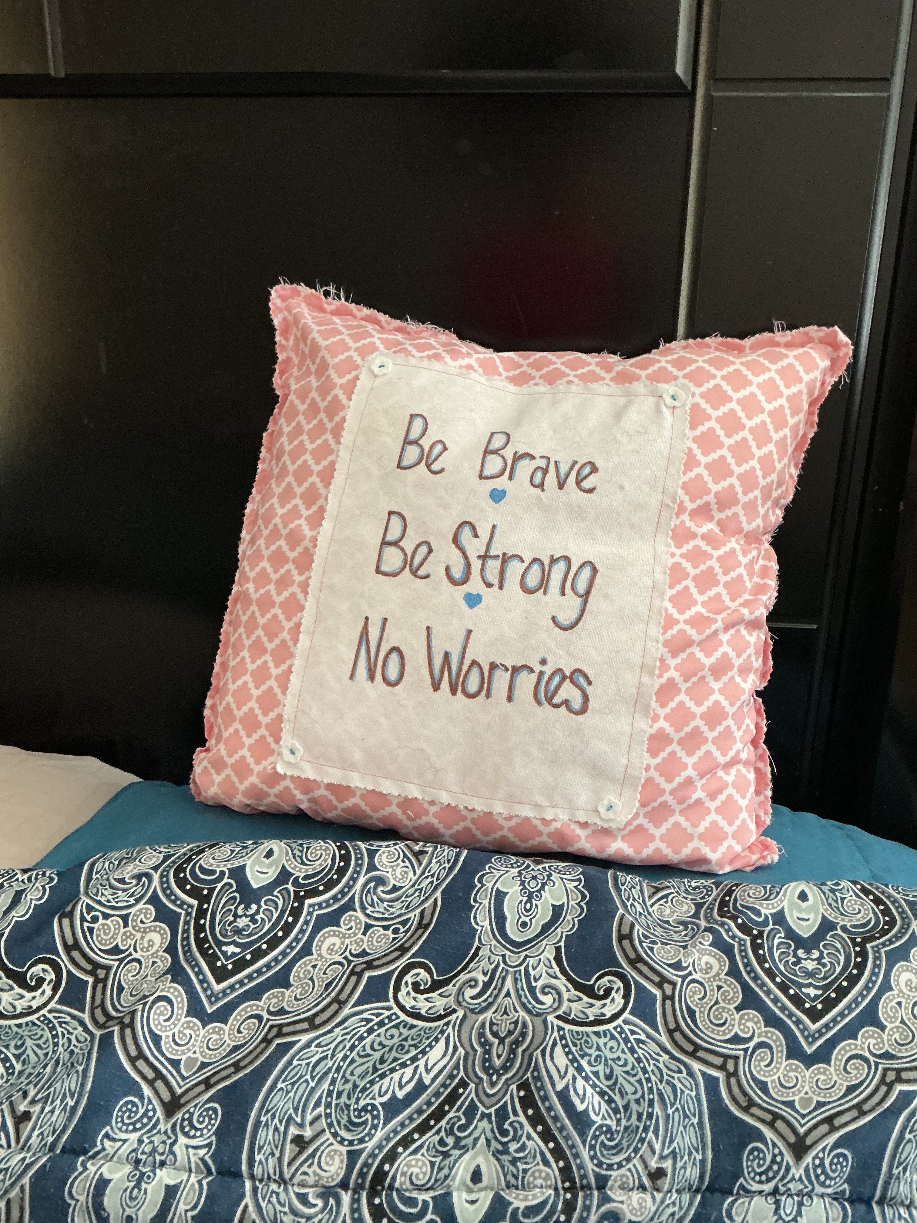 My niece Amanda had pillows made for everyone with the sheets we had to buy for mom’s hospital bed for Christmas. They all have different sayings. Mine is what we would say to her the last few weeks she was alive.