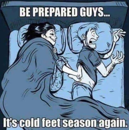 I PLEAD THE 5TH ABOUT WAITING UNTIL MY HUBBY IS SOUND ASLEEP, THEN HAVE HIM SQUEAL LIKE A LITTLE GIRL WHEN MY COLD FEET HIT HIS BACK!